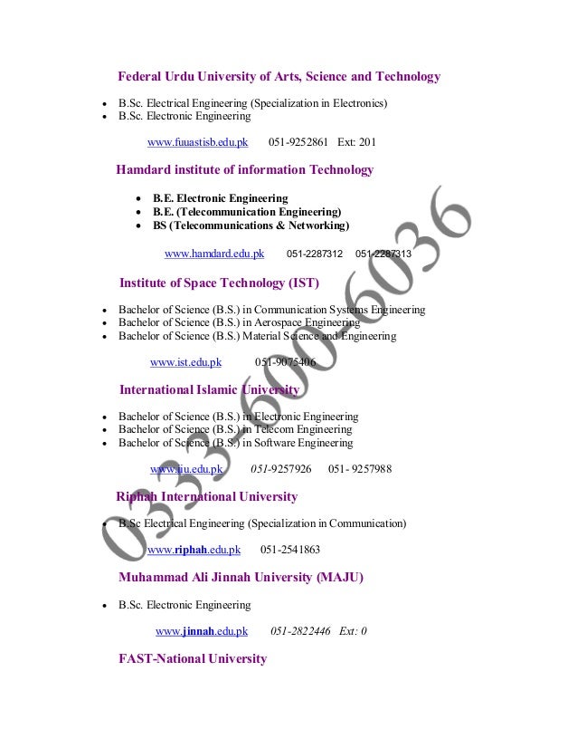 Telecommunication), and Mechatronics Engineering. Bahria University: Bachelor of Engineering in Computer, and Software. COMSATS: B.Sc. Computer Engineering, and Electrical (Telecommunication) Engineering. Institute of Space Technology: Bachelor of Science in Communication Systems Engineering, and Aerospace Engineering. ... Read Content